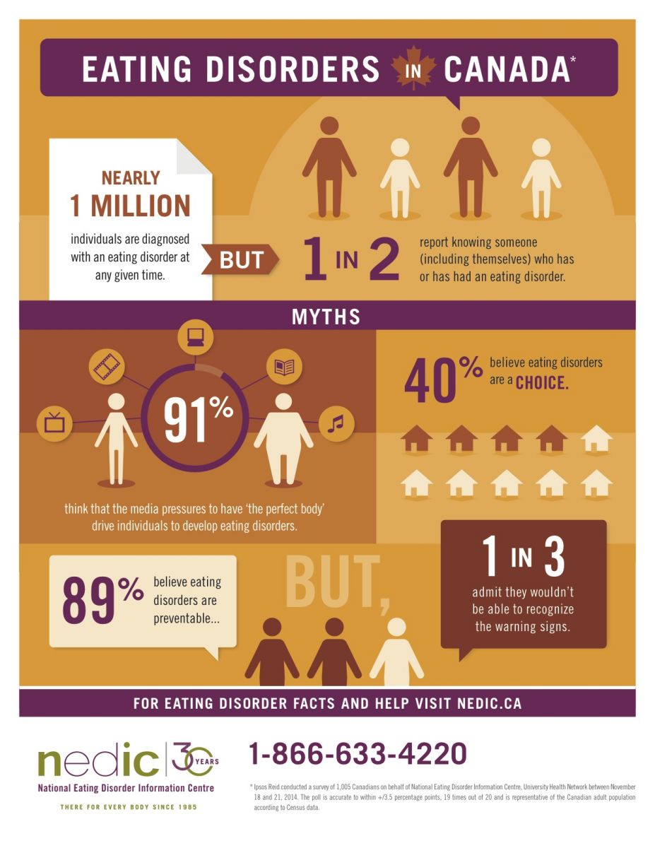 January 26, 2015 (Toronto, ON) – In Canada, it is estimated that as many as 600,000 to 990,000 individuals are diagnosed with an eating disorder, at any given time. However, according to a new Ipsos Reid poll conducted on behalf of the National Eating Disorder Information Centre (NEDIC), one in two (50%) Canadians reported knowing someone (including themselves) who has or has had an eating disorder.